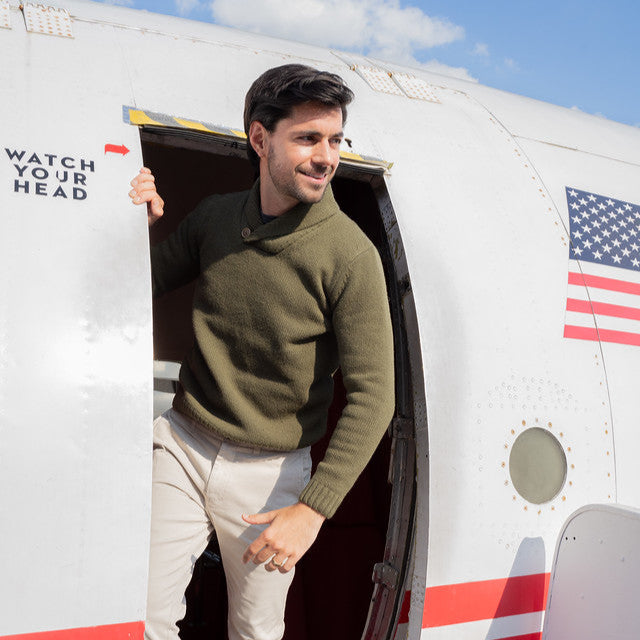Made from soft Italian lambswool, this sweater will keep you warm and looking good, without being itchy! As always, proper sleeve and body length (no extra rolls here!), and a proportional shawl collar, secured with a handsome horn button.