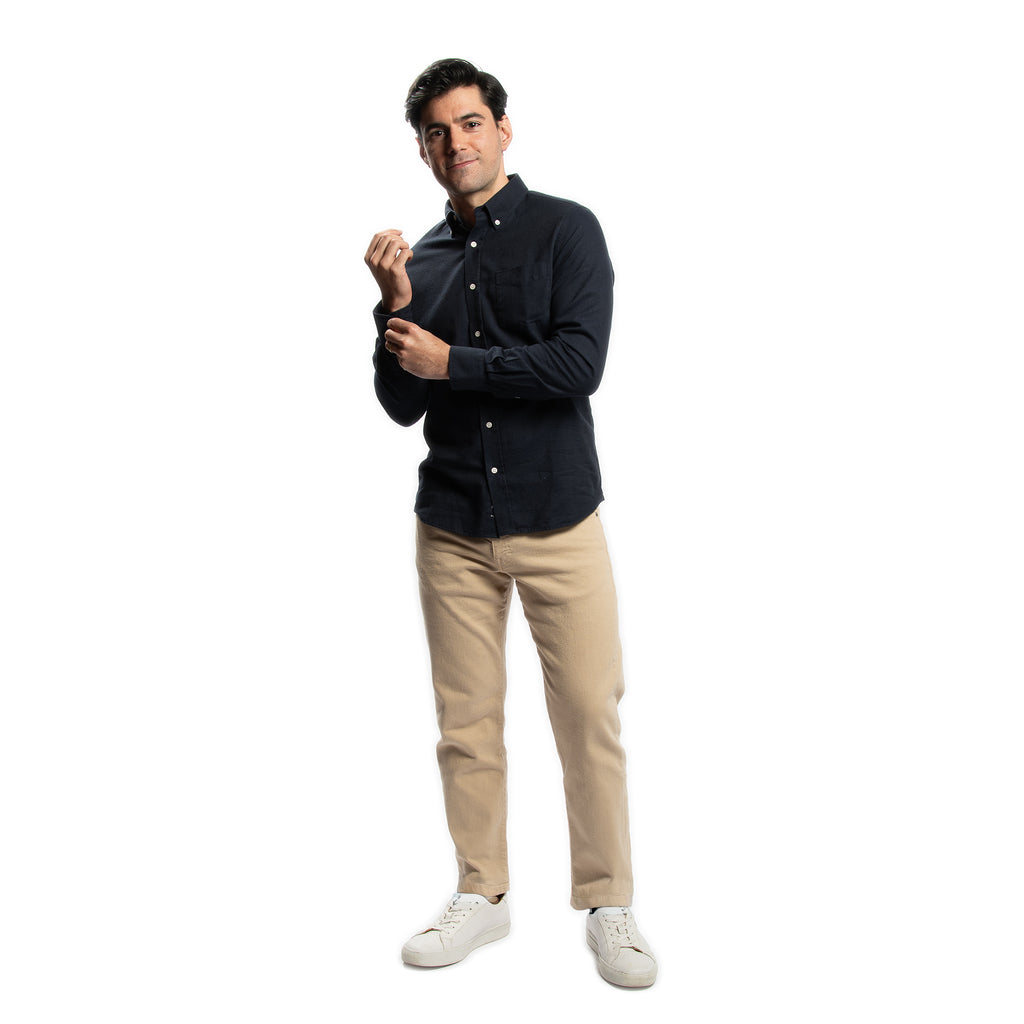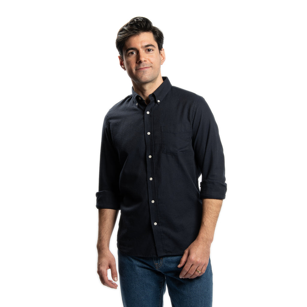 Made from a beautiful cotton merino wool blend fabric from Portugal, these shirts combine the softness and breathability of cotton with the warmth and comfort of merino wool. The merino wool is a great temperature-regulating fabric that also has moisture-wicking and odor-resistant qualities, without being itchy. Soft and warm and done in our Everyday cut.